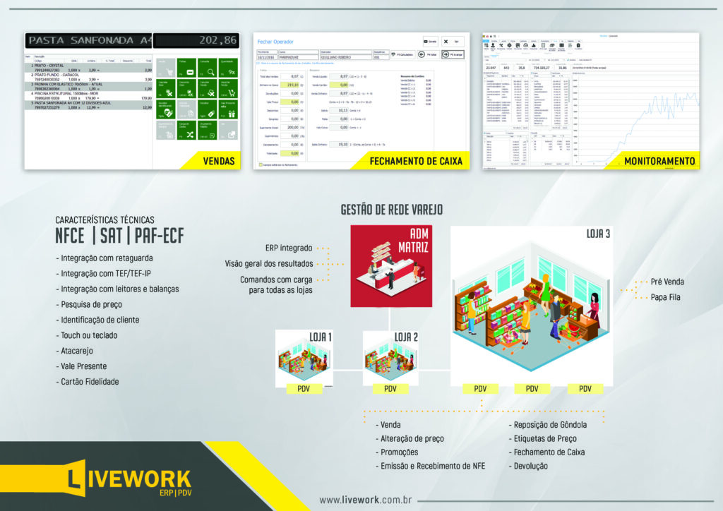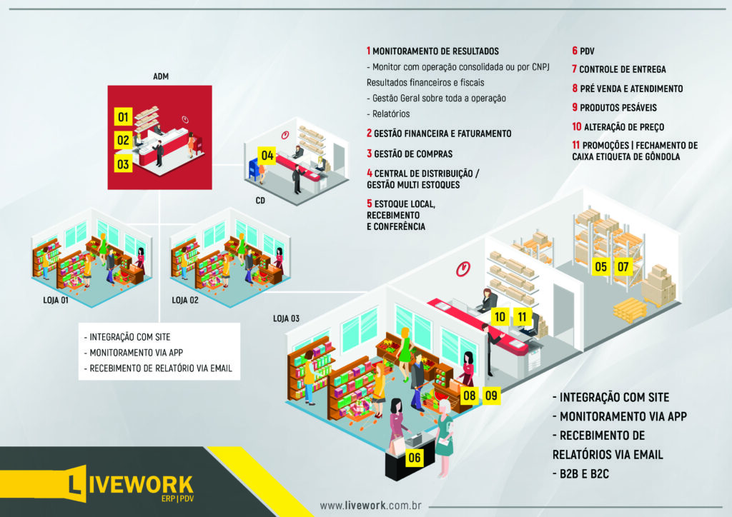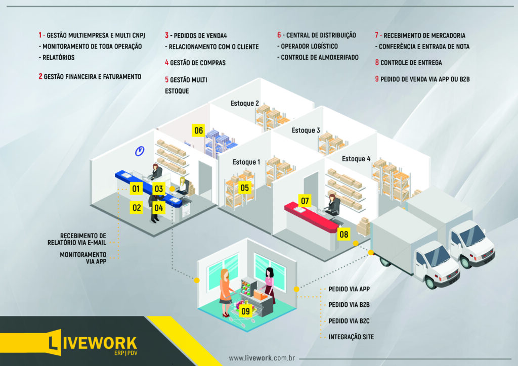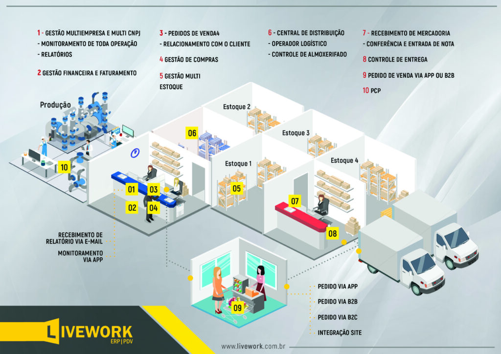 O ERP Livework pensa diferente!, nossa visão de negócio é proporcionar aos nossos clientes uma gestão mais eficaz, simples e rápida. Não falamos do básico, como emissão de NF-e, Estoque, Financeiro, e sim de ferramentas especializadas. Diferente de outros softwares tradicionais, atuamos com módulos específicos e focados em cada segmento, assim melhorando a gestão de cada departamento, podendo customizar de acordo com a necessidade.